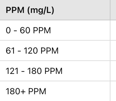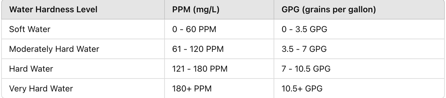 Water Hardness Level PPM (mg/L) GPG (grains per gallon) Soft Water 0 - 60 PPM 0 - 3.5 GPG Moderately Hard Water 61 - 120 PPM 3.5 - 7 GPG Hard Water 121 - 180 PPM 7 - 10.5 GPG Very Hard Water 180+ PPM 10.5+ GPG